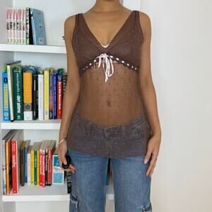 Vintage Sheer Brown Mesh Camisole with Pink Ribbon Detail (S/M)