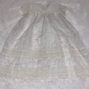 Five piece set. 3 piece dress. Chiffon lace bonnet and satin lace bib.