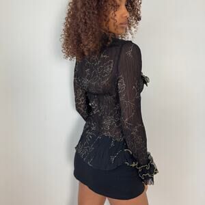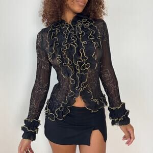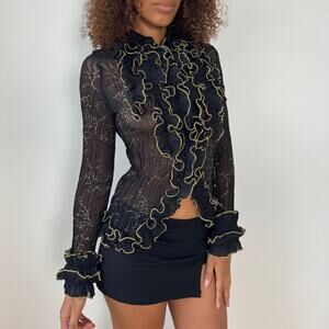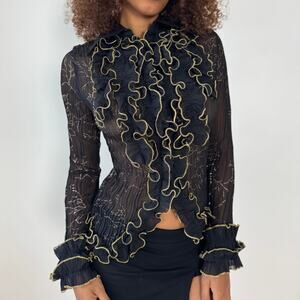 Black sheer mesh blouse with sculptural ruffle placket and cuffs, traced in gold metallic threads; fitted through the waist with a curved hem and classic button front. Hand sourced in Europe.