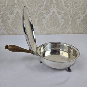 Vintage Sheffield EPC 300 Silent Butler or crumb catcher is made of silverplate and has a gold, wooden handle. The top has a horse engraved. Hinged lid. 3 feet on the bottom. Lovely details along the top edges, feet and the opening handle.