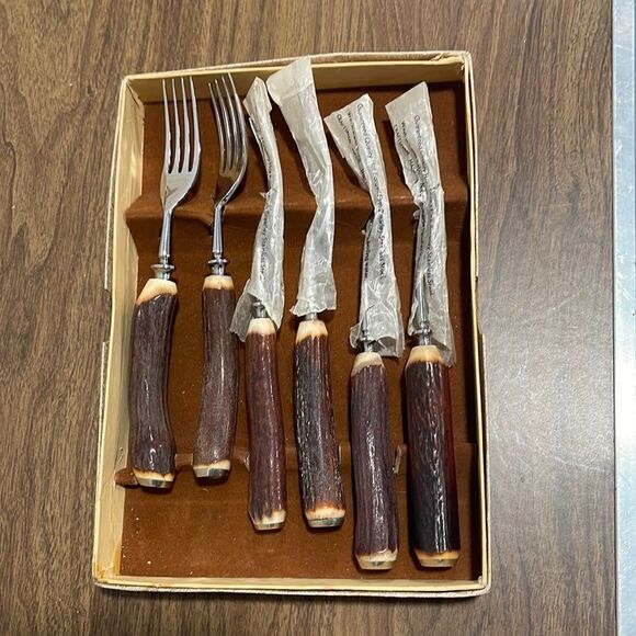 Rare find these are vintage but never used authentic stag bone handle forks with original covers and box!