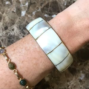 Vintage 1959’s shell and brass bangle. In good condition with a bit of discoloring on a few of the shells. A true vintage beauty! Freshly cleaned 😁!