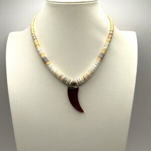 Vintage bohemian tribal-style necklace featuring a polished carnelian gemstone pendant shaped like a claw/fang. The pendant is capped in gold tone metal and strung on natural shell heishi beads in shades of cream and tan, accented by brass tone beads. The pendant measures approximately 1 ½ inches. Barrel clasp closure. Vintage boho/Southwestern surf style. Unisex.