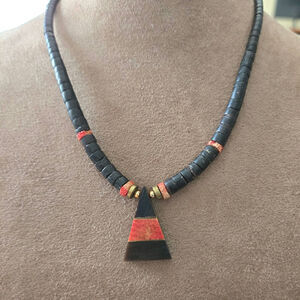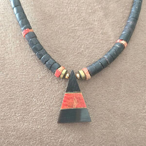 Vintage Shell Native American Heishi and Red Coral Inlay Triangle Necklace 15"