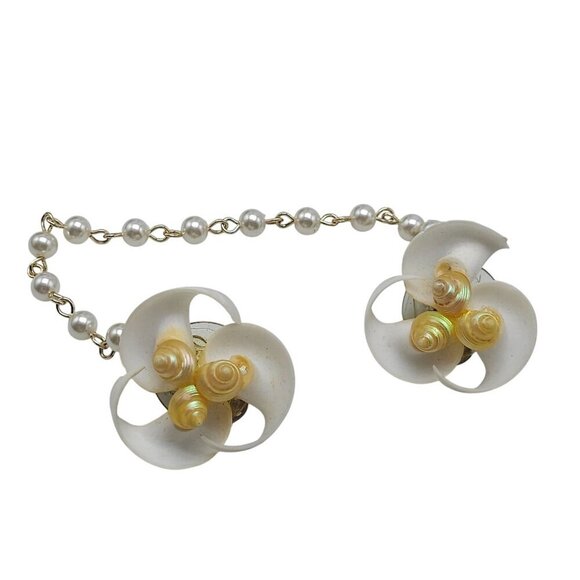 This 1950s vintage sweater guard features delicate shell flower clips and a gold chain adorned with faux pearls. A sophisticated retro accent.