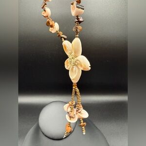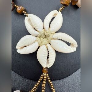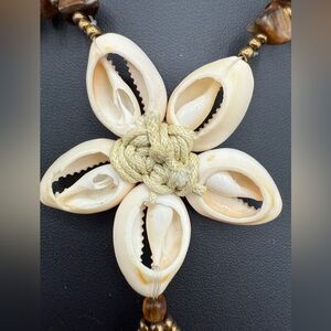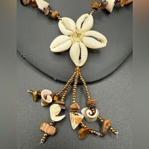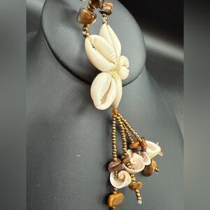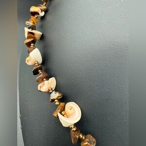 Elegant shell and bead necklace featuring a beautiful combination of brown and cream tones with natural shells and tigers eye stones . Perfect for adding a natural touch to any outfit.