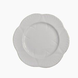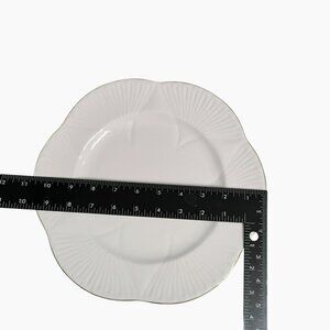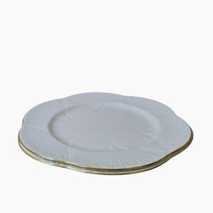 Exquisite mid-century dinner plates from Shelley, England, made of fine bone china, white with gold trim. This listing is for two plates. Fantastic 1940s dinnerware that epitomizes timeless elegance. Crafted from fine bone china, each plate features a scalloped edge and intricate gold trim, offering a touch of sophistication to any dining experience. The plates are a testament to the artistry of vintage English craftsmanship. In excellent shape considering their age, they have a little utensil scratching but little other wear or issues.