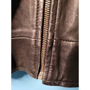 Great jacket showing only mild signs of wear! The color is black, some of the pictures made it look brown due to lighting, but it is in fact black leather! See photos for detail, sold as is.