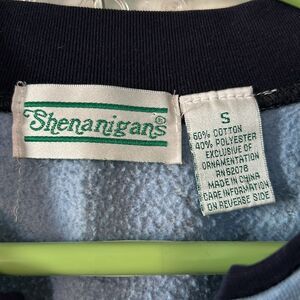 Cotton blend blue Shenanigans sweatshirt material light jacket or cardigan - it can be worn however you like and is a great layer for spring outings. Intricate ivy embroidery next to the button closure.