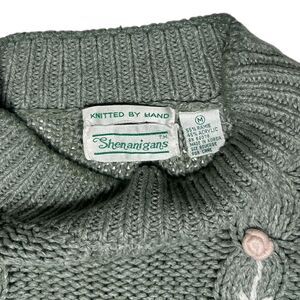 Vintage Shenanigans Knitted by Hand Made Blue Green Knitted Sweater Pink Flowers
