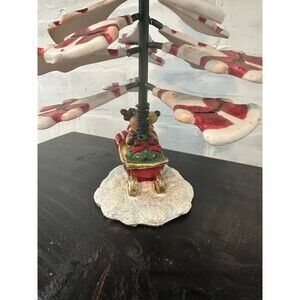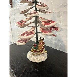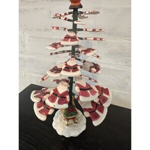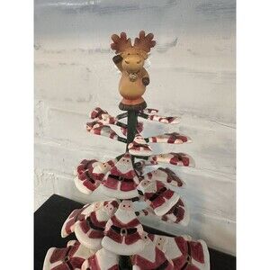 This tree is a unique one! The little Santas are springy and very wiggly. Cute! Makes a clunky sound when wiggled. Stays upright very well. Measures 10 tall x 3 diameter at the base. Shows some wear on the paint, but no missing pieces or any structural imperfections. Please see pictures! Great for a vintage Christmas collector looking for unique decor or gift!