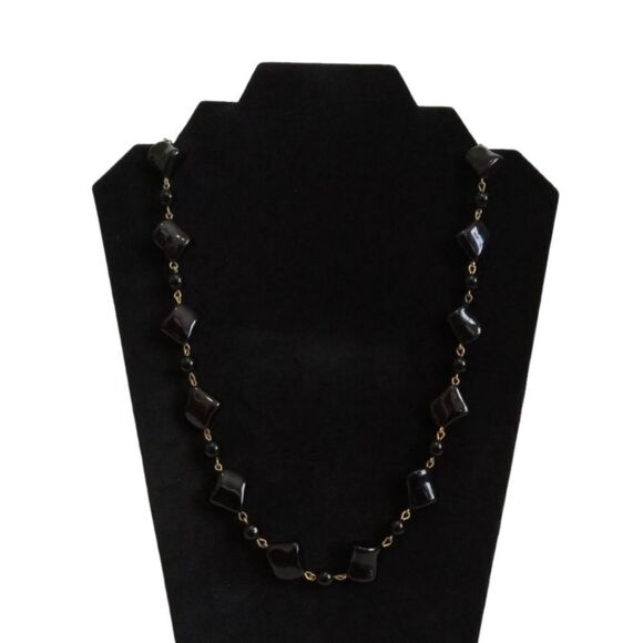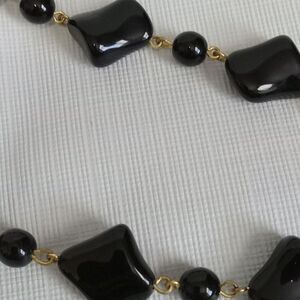 Vintage Shiny Black Faux Stone Beaded Gold Toned Links Single Strand Necklace