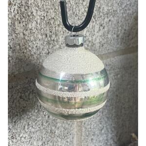Vintage Shiny Brite Christmas Tree Ornament Silver Green White Glitter 3". Good pre-owned condition. Has original crown. No chips or cracks. Please view pictures.