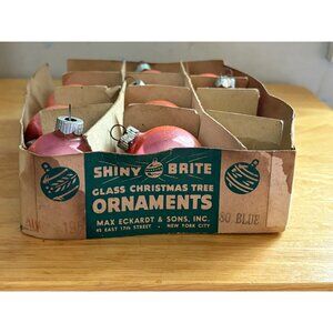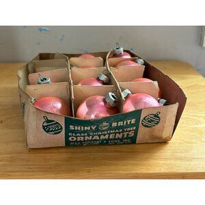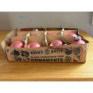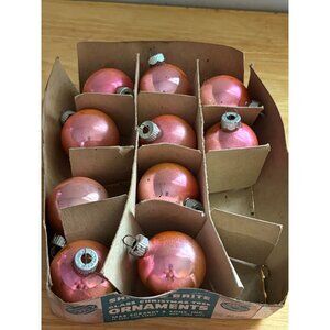This set of 10 vintage Shiny Brite glass ornaments features pink-toned bulbs housed in their original cardboard box, adding nostalgic charm to holiday decor.