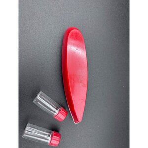 This is a vintage plastic ship salt and pepper shaker set. The shakers are the two clear plastic "smokestacks" with red tops.
