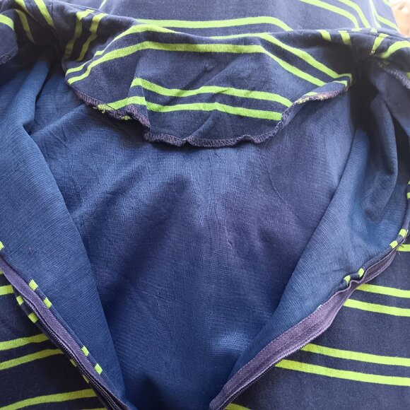 This vintage dress boasts a timeless blue and green striped pattern. The short sleeves and pocket details add functionality, while the back zipper closure provides ease of wear. A charming addition to any wardrobe, embodying retro charm and practical design.