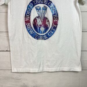 In good condition. White t-shirt with blue/pink ombre glitter World Trade Center graphic. Single stitch. Made in USA. Refer to pictures for measurements. From smoke-free/pet-free home.
