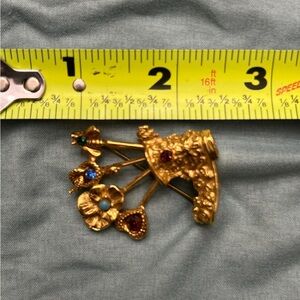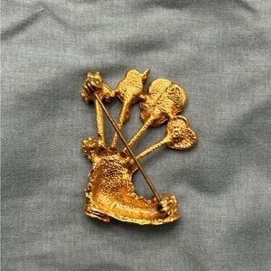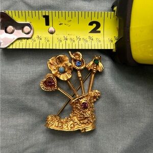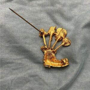 Shoe Boot Brooch With Hat Pins. Victorian style Goldtone. It has a bee, a snake, a flower and a heart. I don’t know what it’s made of or the age. The pin clasp opens and closes with ease. None of the stones are missing. See pics for size.
