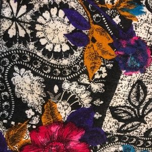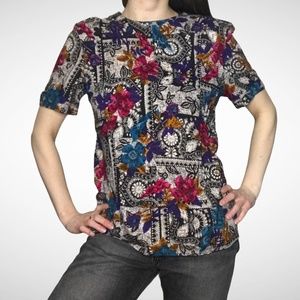 Vintage Norton McNaughton short sleeve blouse with blue and pink flowers with gold leaves over black and white pattern. Keyhole closure in back with button. Slightly narrow cut of shirt, fun to wear either tucked in or loose. I believe fabric is rayon.