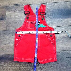 Vintage In Design Kids 12 M Red Shortalls Overalls Alligator Frog Friends 12M 12 Months. Great pre-owned condition. See pics for approx measurements and details.