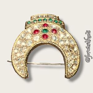 At the center of the crescent, a cross-like arrangement of vibrant red and green rhinestones adds a striking touch of color. The lower portion of the pin showcases alternating green and clear rhinestones, providing a balanced and eye-catching design.