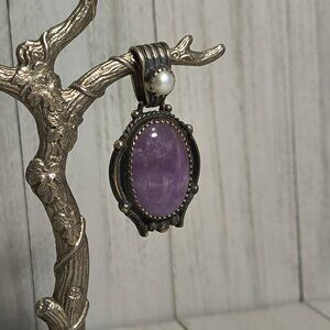 Beautiful vintage Shube Dakota West pendant crafted in solid sterling silver. Features a large oval cabochon amethyst gemstone with natural inclusions and a lustrous cultured pearl accent at the bail. The ornate sterling silver setting has a bold, handcrafted look and is stamped “SD Sterling” on the reverse.
