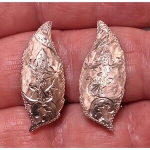 Beautiful vintage Siam sterling brooch and earrings set. Very pretty swirled leaf shapes engraved with the goddess and foliage. Clip backings on the earrings. All three pieces are marked Siam Sterling and have a hallmark of initial S in diamond shape.