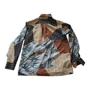 Shirt has a groovy 70s patchwork design featuring birds, flowers, and bamboo.