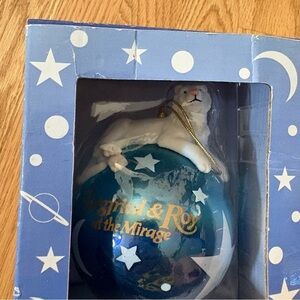 Siegfried & Roy ornament featuring a blue globe with a white lion. Perfect for collectors.