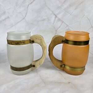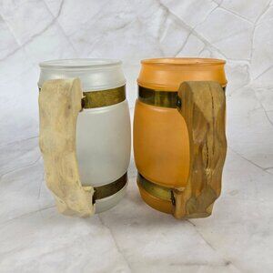 Set of 4 colorful mugs in a fun barrel shape from Siesta Ware. The mug is made of glass and has a wooden handle with metal bands that secure it around the glass. Fun colors make it easy to distinguish who the drink belongs to.