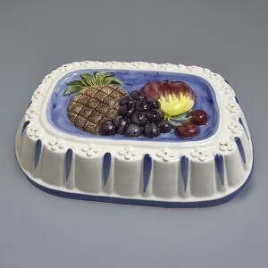 Add a pop of retro charm to your kitchen with this vintage wall plaque by Sigma the Tastesetter. This 3D ceramic piece features a raised fruit design including a pineapple, apple, grapes, and cherries, all hand-painted in rich tones.