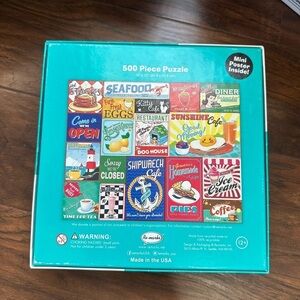 Puzzle in perfect condition. Box has some wear. 500 piece jigsaw puzzle by Re-marks. Recommended years of 8+. Finished product size is 16 in x 20 in (40.6 cm x 50.8 cm). Made from 100% recycled material. Quarter used for piece size reference.