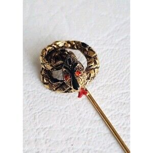 This vintage signed ART gold tone rhinestone snake serpent brooch hat pin features a multicolor enamel design on a gold plated base. The brooch measures 2.5 inches in length and is signed by the brand ART. With a theme of art, this original piece is a unique and stylish addition to any fashion collection, suitable for both men and women. Made in the United States, this brooch showcases a snake serpent design with rhinestone accents, perfect for adding a touch of vintage charm to any outfit.