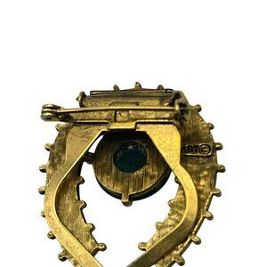 Add a touch of vintage elegance to your outfit with this stunning ART brooch. The piece is crafted with a gold tone base metal and features a beautiful green gemstone. The brooch is signed by the artist, adding a unique touch to the piece. Perfect for those who love vintage and antique jewelry, this brooch is a must-have for any collection. The brooch is perfect for adding a pop of color to any outfit and is ideal for both formal and casual occasions.
