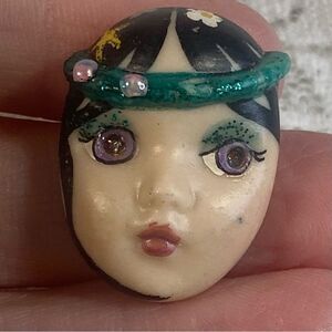 Set of three handcrafted face brooches. Features vibrant accents in green, yellow, and blue. Unique and artistic design.