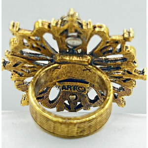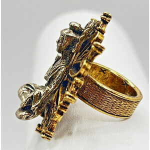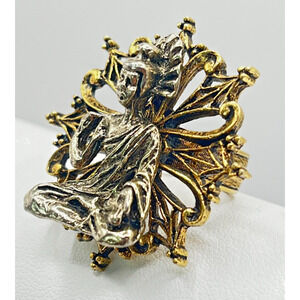 This vintage ring is a unique piece signed by Arthur Pepper. The gold and silver tone band features a beautiful buddha statement that adds a touch of elegance to any outfit. The ring is a size 3 1/4 and is perfect for various occasions such as engagements, graduations, and birthdays. The ring is a great addition to any vintage jewelry collection and is perfect for those who appreciate art. The piece is categorized under Rings, Vintage & Antique Jewelry, and Jewelry & Watches. Get your hands on this one-of-a-kind piece today!