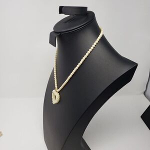 Chic vintage Avon necklace featuring a faux pearl strand and a 3D puffy heart pendant. Exudes a glamorous princess vibe. Perfect accessory for a sophisticated, elegant look.