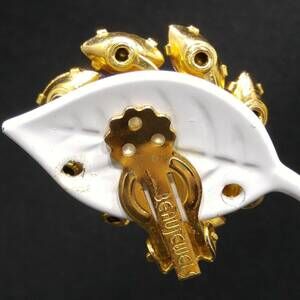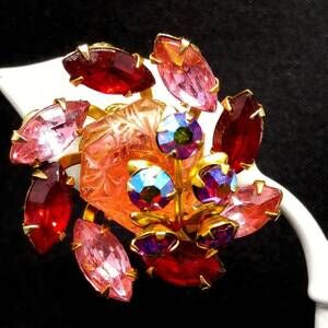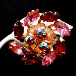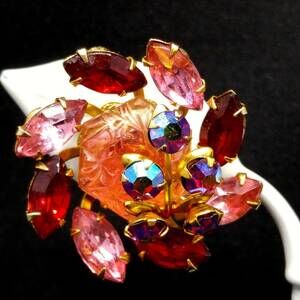*Description: This is a beautiful pair of Beau Jewels mid-century pink and aurora borealis red rhinestone floral earrings with pink art glass under a red floral spray from the last half of the 1950s. The pink and red marquise cut rhinestones encircle each earring. The earrings are set with rivets which give each petal a 3D look on your ears. The rhinestones are prong set and the clips are signed BEAU JEWELS. Gorgeous earrings! This would be a great addition to your vintage jewelry collection or make a great vintage gift!