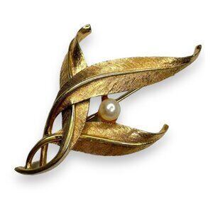 Vintage Signed BOUCHER Brushed Gold Tone & Faux Pearl Overlapping Leaf Brooch