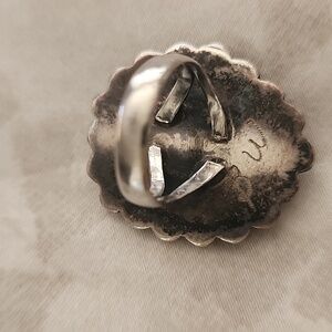 This unique vintage ring features a beautifully crafted turquoise stone, set in a sterling silver band. The ring is signed with the initials 'BW' on the back, indicating its authenticity and craftsmanship. The band has a scalloped edge, adding to its vintage charm. This piece is perfect for collectors or anyone looking for a statement accessory. Ring size is approximately 7. In excellent vintage condition with minimal signs of wear.
