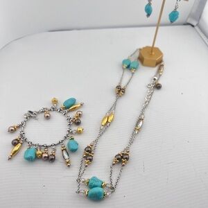 This gorgeous pieces are signed with the Brighton heart hang tag. This necklace has a silver tone chain with turquoise, clear crystals, gold tone patterened beads and spacers and faux gray (hematite in color) beads. Earrings and bracelet also. This set is NWOT.