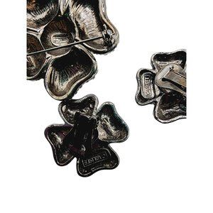 This vintage jewelry set includes a brooch and clip earrings. It features a four-petal flower shape adorned with pave rhinestones. All are signed. It is pretty heavy and well made.