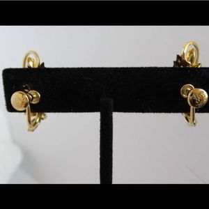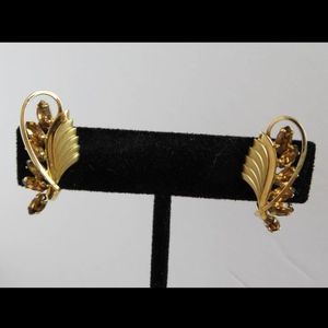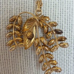 Beautiful gold filled necklace & screwback earring set from the 1950's made by the Curtis Jewelry Manufacturing Co. from Providence, RI. It is 1/20 14KT gold filled. All 3 have stamps :"DCE" (Large D with c over e) Curtis Jewelry Manufacturing Co. Also " 1/20 14KT GF". Excellent vintage condition. All stones are present. Minor wear/tarnish on the leaf of the pendant. Minor tarnish on chain clasp. Pendant: 1 & 1/2 in long, 1 & 1/2 in wide Earrings: 1 in long, 1/2 in wide chain 9 in