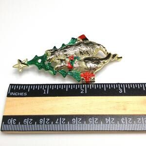 *Description: This is a great Christmas brooch with two loving cats sitting in front of a Christmas tree with their tails intertwined from the 1990s. The brooch is gold plated and I tested it up to 18K gold. This brooch is pictured on page 8 of "Christmas Tree Pins O Christmas Tree" by Nancy Yunker Trowbridge. The brooch pictured is this exact brooch with the green and red enamel on the gold plated background. AJC designed several brooches using this design. This particular one has metallic green and red enamel painted on the gold plated metal. This brooch would be a great Christmas gift for someone who loves cats. This would be a great addition to your vintage jewelry collection or make a great vintage gift!