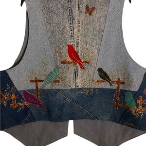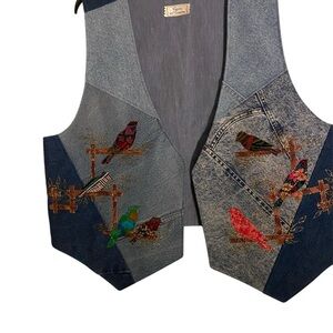 Unique denim vest with vibrant bird embroidery. Features a mix of blue denim shades.