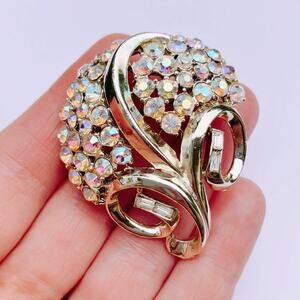A sculptural Coro brooch bursting with aurora borealis shimmer, this mid-century piece captures the glamour and craftsmanship of vintage costume design in full flourish.
