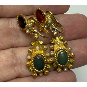 Vintage Signed Coro Gold Tone Clip Dangle Earrings Faux Jade Enamel Seed Pearls. 1.5" drop. Light wear. No missing stones.