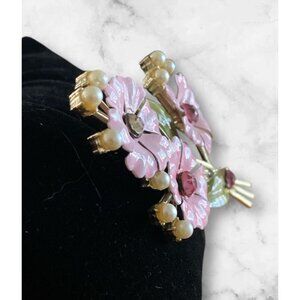 Vintage Signed Coro Silver Brooch With Pink Enameled Flowers Pearls Rhinestones