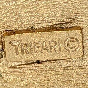 This Trifari brooch is a splendid representation of mid-century jewelry design. The leaf motif, rendered in a gold-tone finish, exudes an air of timeless elegance. Crafted with attention to detail, it serves as both a fashion statement and a collectible vintage piece. Ideal for adding a touch of classic sophistication to any ensemble.