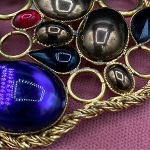 Stunning and cool vintage piece with large and small hematite and glass jewel colored cabochons on a circular, geometric gold tone base with textured rope outer design. Gripoix, Mogul inspired design, this is a bold, high end looking quality brooch